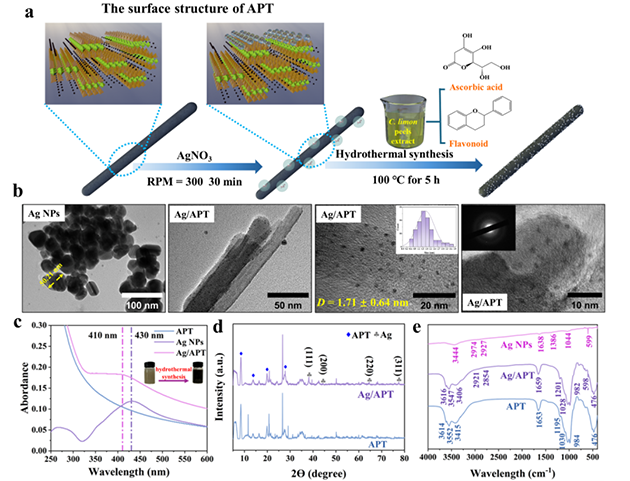研究人員采用檸檬皮提取物介導(dǎo)的低溫水熱法,利用所含抗壞血酸與多酚類物質(zhì)將Ag+還原為Ag0,并原位均勻錨定于凹凸棒石納米棒晶表面,構(gòu)筑了銀納米粒子尺寸小于2 nm的Ag/凹凸棒石復(fù)合納米酶(Ag/APT)(圖1)。該礦物復(fù)合納米酶比AgNPs具有更大的比表面積和更多的活性位點。對多重耐藥菌性耐甲氧西林金黃色葡萄球菌(MRSA)和產(chǎn)超廣譜β-內(nèi)酰胺酶大腸桿菌(ESBLs-E.coli)均表現(xiàn)出優(yōu)異的廣譜抗菌活性。